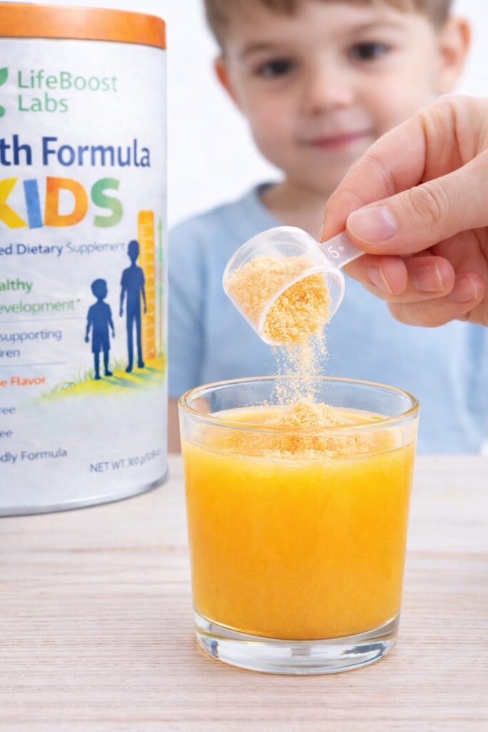 A powdered nutritional formula designed to support healthy growth and development in children by providing essential vitamins, minerals, and amino acids that contribute to bone development, physical growth, and overall nutritional balance during key growth stages.